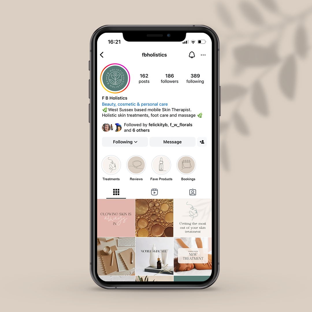 It was important to FB Holistics that their brand worked hard for them on social media, a platform where they would get a lot of their bookings. So I created a stamp variation of the logo that would be suited to working at a small scale in a profile image.